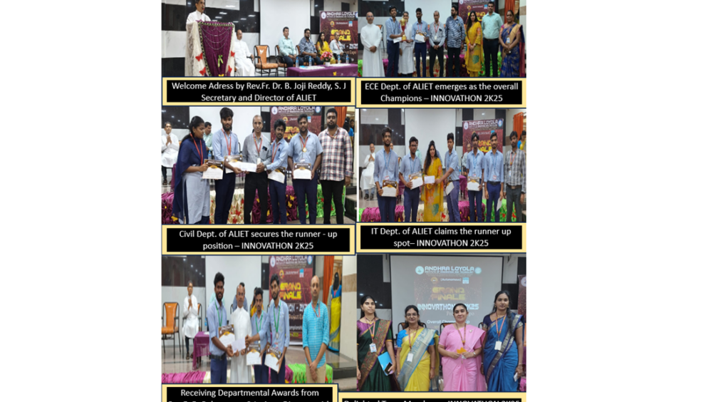 The highlight of the ceremony was the announcement of the Overall Champion, which was announced by Rev. Fr. Dr. B. Joji Reddy, S.J., Secretary and Director Rev. Fr. D. Balaswamy, S.J., Assistant Director. The Championship award was bagged by the ECE Department of ALIET for their project, entitled “Personal Assistance DH Women Safety”. The team received the Rolling Shield, along with medals, certificates, and a cash prize of ₹5,000. The runner-up positions were tied between the Civil Engineering Department for the project entitled Hydro Renewable Energy Power and IT Department Kisan Harith Mithra project, both receiving medals, certificates, and a cash prize of ₹2,500. Departmental winners were also awarded cash prizes, with ₹3,000 for first place, ₹1,000 for second place, and ₹500 for third place, in addition to medals and certificates.