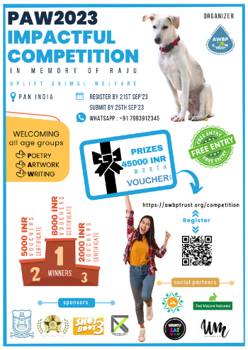 We are happy to announce the launch of the 5th PAN INDIA Competition “PAW2023”, in memory of Raju, the dog who inspired this movement. PAW is a vibrant annual initiative to connect all age groups to animal welfare by showcasing their creative skills like poetry, artwork, and writing. All age groups can participate in this competition under three categories Poetry, Artwork, and Writing.